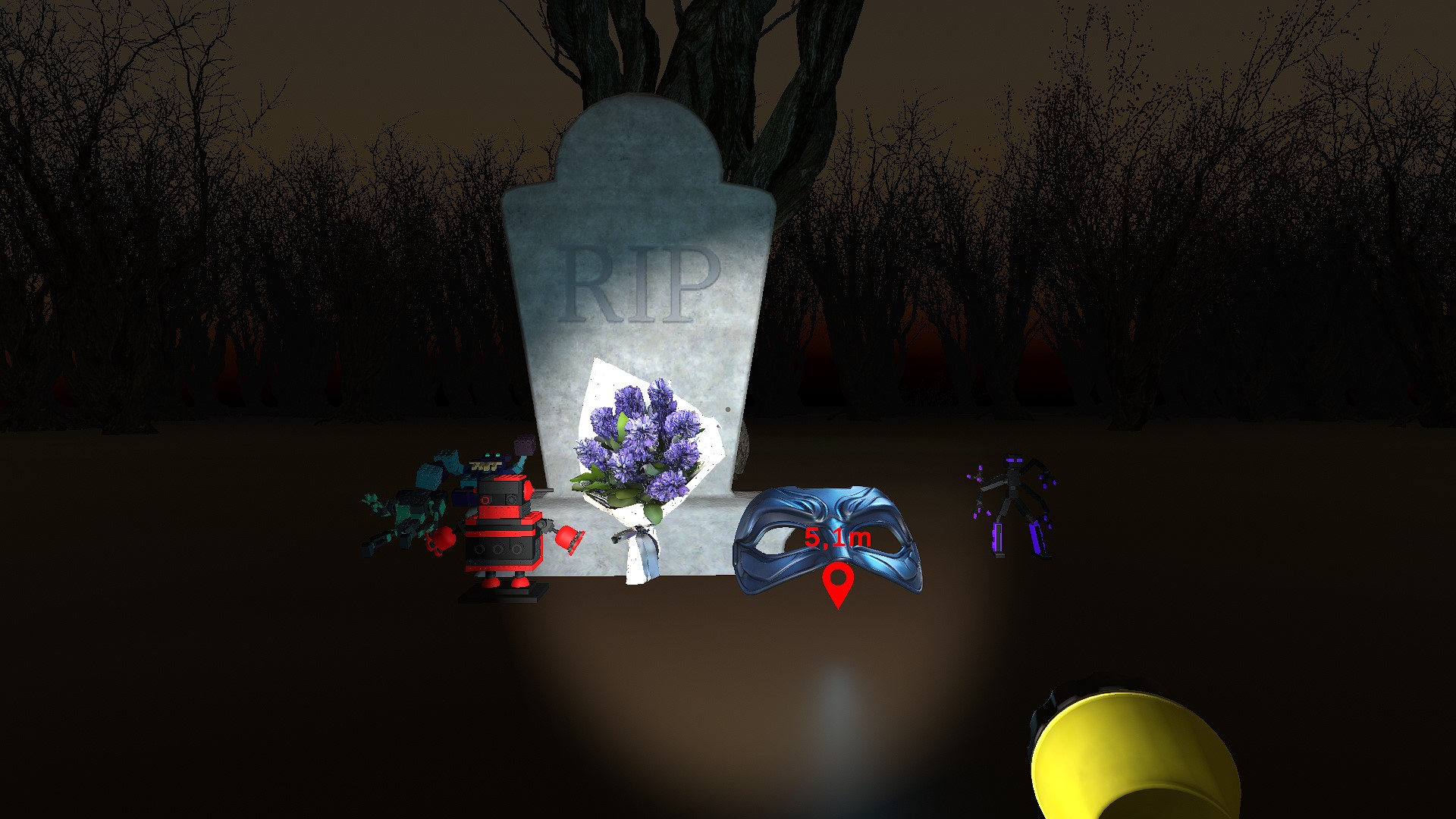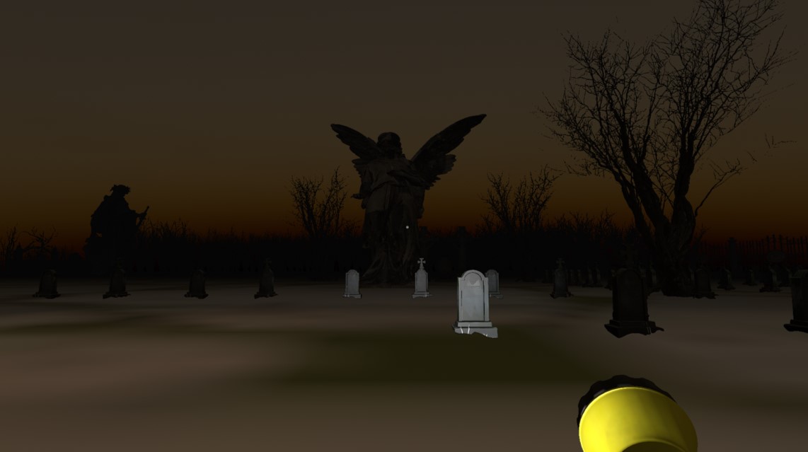 Ahi volvi aprobarlo, me encantan los modelados y como esta hecho el cementerio, me gusta el efecto de cuando te pones la mascara y vez el otro mundo. Pero no se como atacar a los fantasmas y a los monstruos